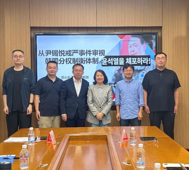 学术活动的鼎力支持。在讲座中,蔡永浩教授首先以“尹锡悦戒严事件”为背景,介绍了韩国宪法中的分权制衡设计,其中包括韩国国家机关的传统设计和政党设计。进而,蔡永浩教授按照事件的发展脉络,清晰展现了戒严事件中分权与制衡的运作,并深入阐释了韩国宪法体制下国家权力之间和政党之间的对抗。最后,蔡永浩教授就戒严事件中出现的宪法问题进行了深刻的宪法思考,在座师生深受启发。