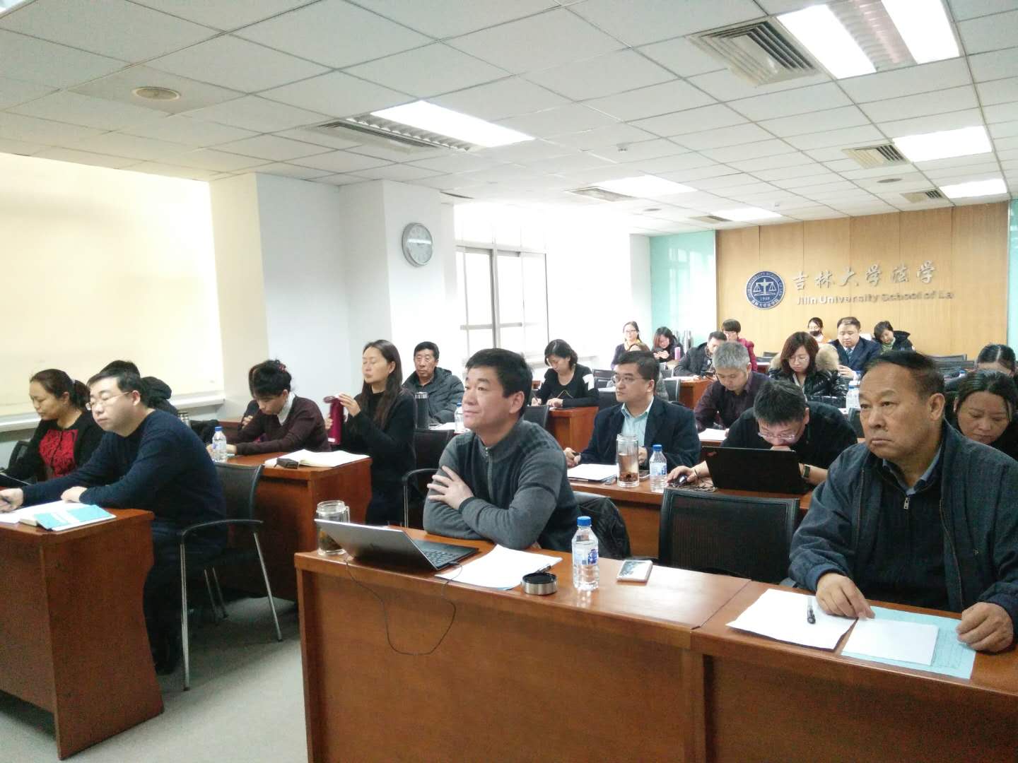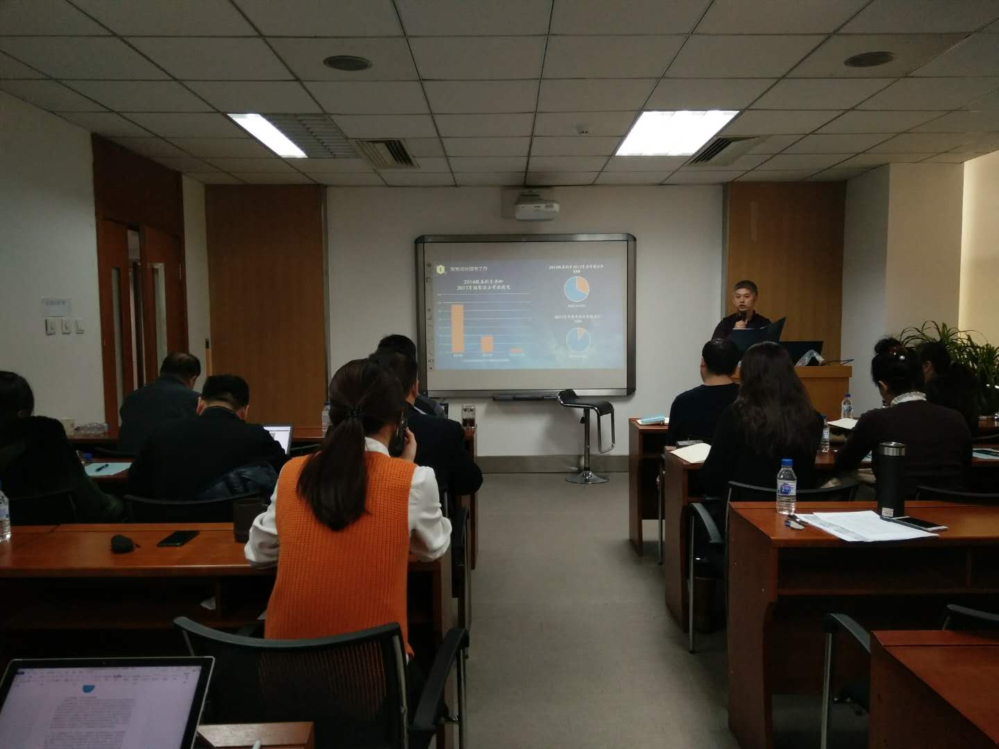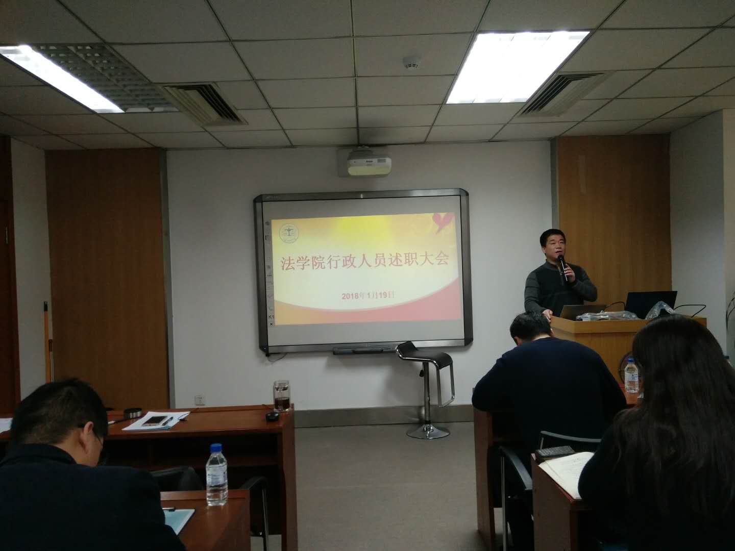 随后,各行政教辅工作人员依据本人的岗位职责,结合德、能、勤、绩、廉的相关要求,紧紧围绕自己在本学期所做的实际工作通过PPT形式展开述职,每人限时七分钟。任戈非老师作为第一个述职汇报人,对自己在2017年下半年开展工作的情况作了详细的回报,汇报内容丰富充实。接下来,院办刘伟、于冰、谷鑫贺,研办孟庆红,学办高岩、马旭、骆旷达,法律硕士中心王立国以及其他行政教辅人员依次进行了述职汇报。