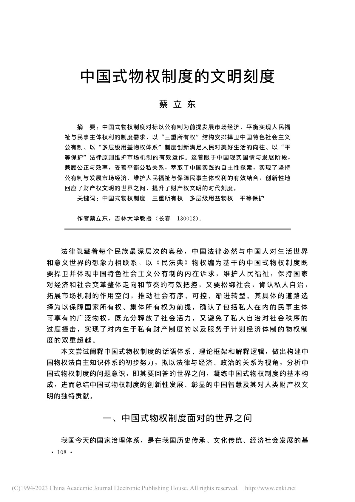 蔡立东教授在《中国社会科学》2022年第12期发表题为《中国式物权制度的文明刻度》的文章。该文是蔡立东教授继《从“权能分离”到“权利行使”》等文章之后在物权法律制度研究领域的又一力作。文章通过阐释中国式物权制度的话语体系、理论框架和解释逻辑,着力构建中国物权法自主知识体系,以法律与经济、政治的关系为视角,分析中国式物权制度的问题意识,凝练中国式物权制度的基本构成,总结了中国式物权制度的创新性发展、彰显的中国智慧及其对人类财产权文明的独特贡献。