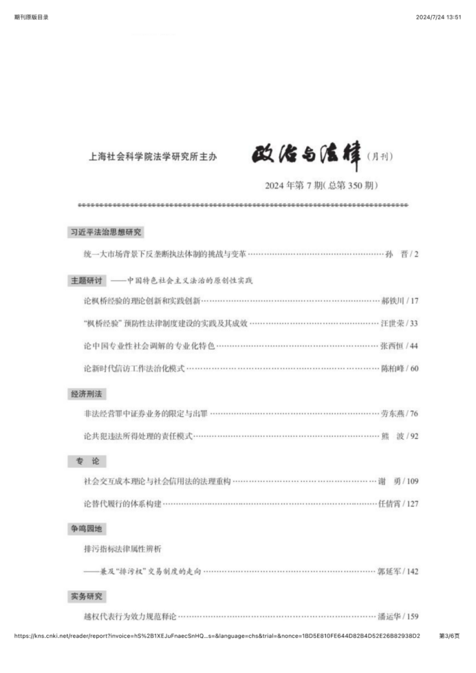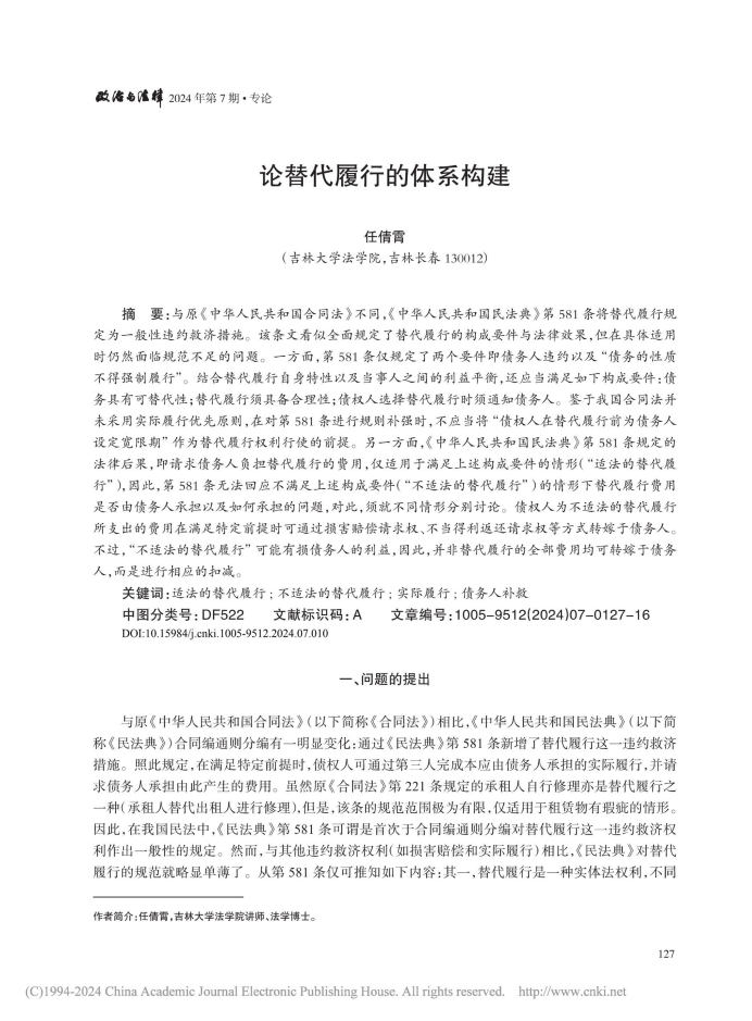 任倩霄老师在《政治与法律》2024年第7期发表题为《论替代履行的体系构建》的文章。