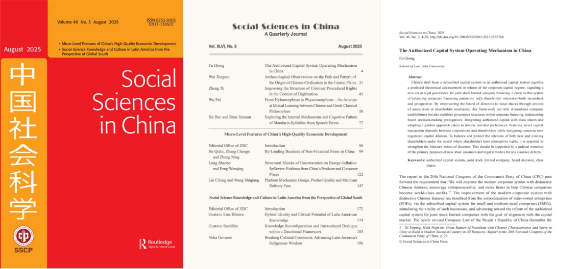 傅穹教授在《中国社会科学》(英文版)2025年第3期上发表题为《The Authorized Capital System Operating Mechanism in China》的学术文章,该成果原刊发于《中国社会科学》2024年第6期。文章紧扣中国公司资本制度改革的时代背景与规则创新实践,以授权资本制在我国的落地实施为研究核心,系统梳理了该制度在国内资本市场的适用场景、运行逻辑与实践特征,深入剖析了制度落地过程中的适配性问题与优化路径,同时结合中国企业发展实际与资本市场监管要求,提出了兼具理论价值与实践可操作性的完善建议。这一研究成果精准回应了中国特色现代企业制度建设中的现实需求,为进一步优化公司资本制度设计、规范资本市场运作、促进各类市场主体高质量发展提供了重要的理论支撑与实践指引。